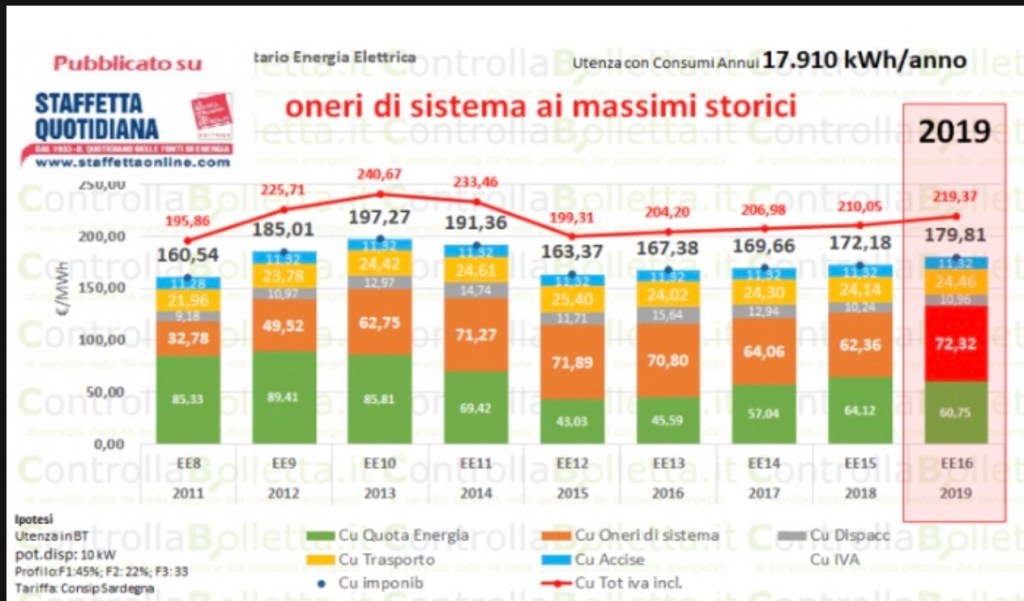 Dal 2013, “trasporto” e OGS valgono più della materia energia (verde) e quando mai, in un paese normale,il costo del trasporto dell’energia elettrica supera il costo di produzione della stessa?